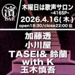 ML.濱書房PRESENTS BAR濱書房~木曜日は歌声サロン~226SP 2026年2月26日(木) 【歌声タイム出演】玉木慎吾 / 小林写楽 / TASEI&鈴蘭 開店 18:30 閉店 21:5 ...