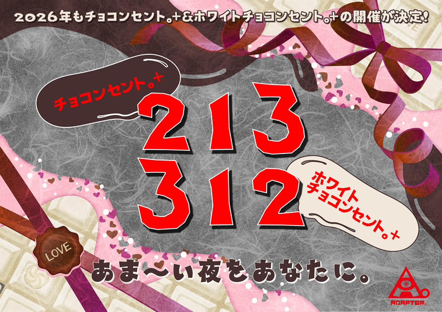 HOME > news > 3-12 ホワイトチョコンセント。+-2026- 2025年12月15日 コンセント。+限定 ホワイトチョコンセント。+-2026- 20026年3月12日(木) 【出演】ADAPTER。 OPEN 18:30 START 19:00 | ADV \4,500 DOOR \5,000 D別 FC限定のため一般発売なし ※入場チケットの販売はFCのみ ※配信詳細もFCページにてご確認ください -news, news_live, webcast